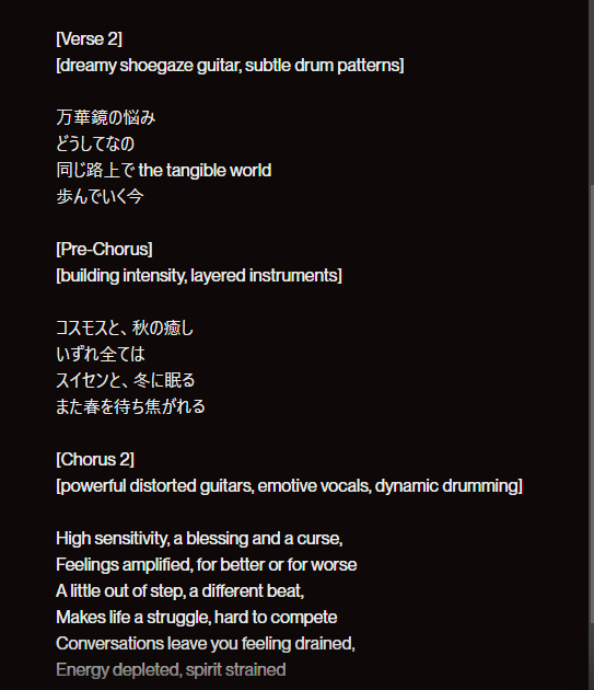 [Verse][Pre-Chorus][Chorus][Bridge](日本ではAメロ、Bメロ、Cメロ)を全く意識してなかったほど、この曲制作時は無知でしたが、SunoAIがプロンプトだけでいい感じのメロディーにしてくれて、一番気に入っている曲です。