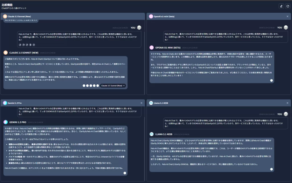 AIの回答内容と言えば、Felo AI Chat で、最大4つのAIモデルの応答を同時に比較できる機能が導入されるようです。これは非常に実用的な機能だと思います。