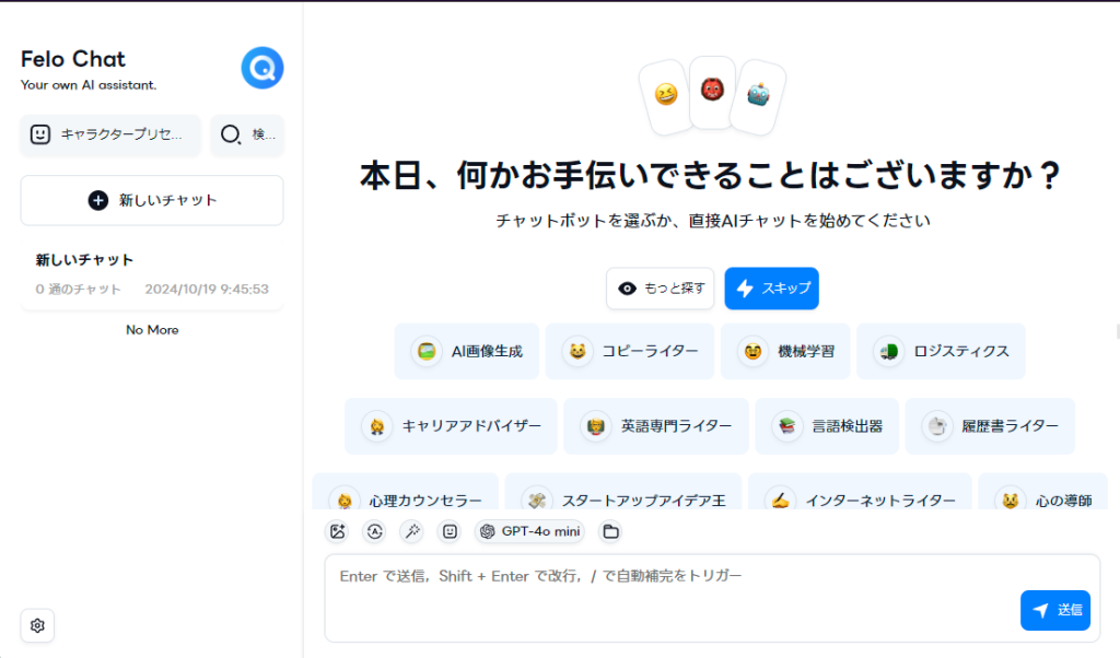 また、画像で示されているように、Feloはチャットボットだけでなく、AI画像生成、コピーライター、機械学習など、様々な機能を提供しているようです。
